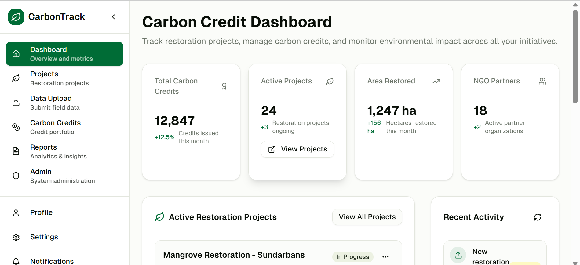 Developed an environmental restoration dashboard that allows users to track and manage multiple restoration projects, monitor carbon credits issued, visualize environmental impact metrics (like total carbon credits, area restored, and project progress), and view detailed project and partner data in an intuitive platform.